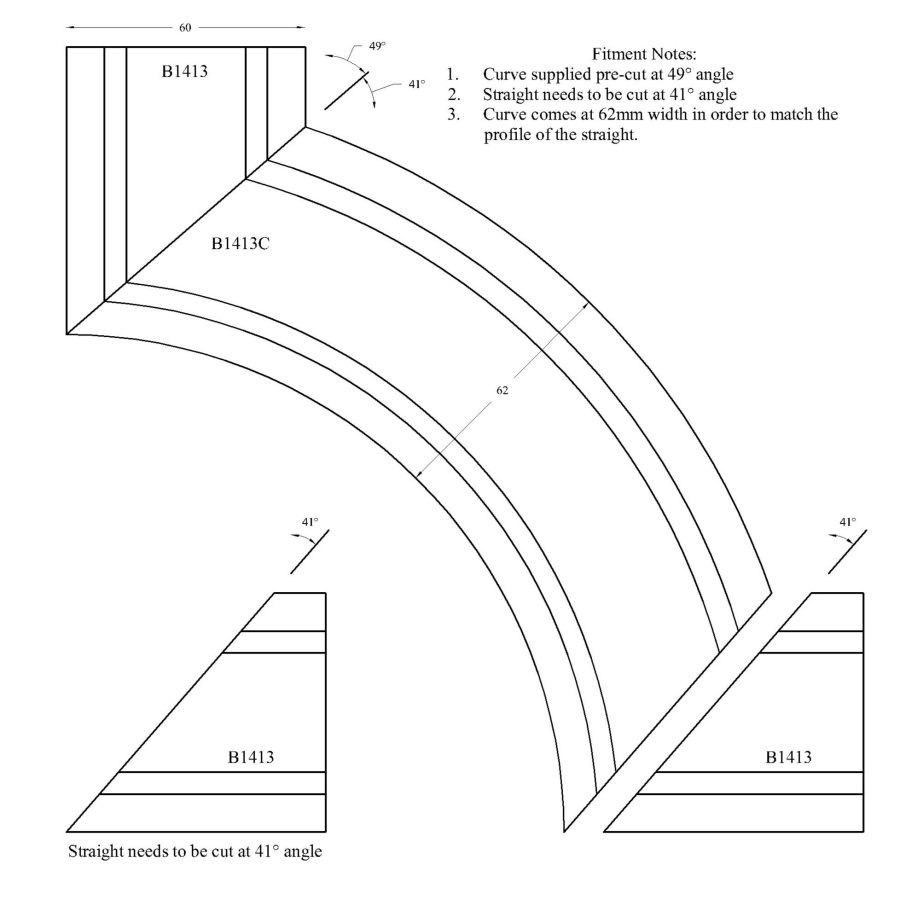 Curved corner astragal bead for B1413, 125mm radius scalloped corners. Pre mitered to 49°. Cutting Dims are on PDF below.